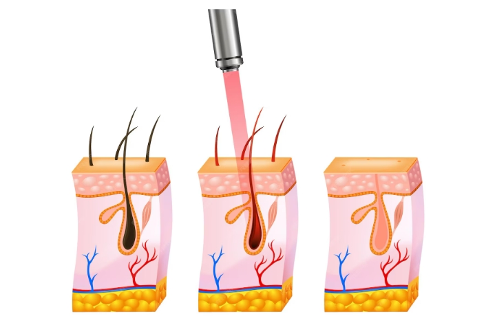 雷射除毛是利用特定波長雷射的「選擇性光熱療法」,以毛囊黑色素為標的,將熱能傳導至毛囊根部並破壞毛囊組織,達到抑制毛髮再生與半永久除毛效果。通常需要 4 至 8 次療程(每次間隔約 4-8 週)來覆蓋不同毛髮生長週期,以達到長期的平滑效果,雷射除毛能有效且安全地減少毛髮生長,比起傳統的刮毛或拔毛,更不容易造成色素沉澱或毛囊炎。