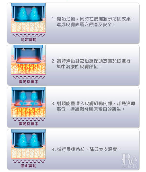 電波拉提(Thermage)探頭直達皺紋和組織鬆弛的根源,按照在皮膚上的規劃的框格, 定格刺激並增加皮膚自身的膠原,借著熱能使膠原蛋白收縮, 以精確定位的方式高效啟動皮膚膠原與纖維,煥醒膠原蛋白重生,重構膠原支架。 從而實現深度緊膚、提升及抗皺的獨特功效。