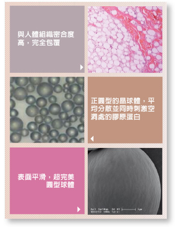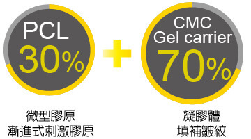 由於凝膠載體有最佳的黏度和彈性, 因此皺紋及皺褶會在治療後立即獲得改善。微求懸浮液的凝膠在體在治療經過數周後, 會被人體逐漸吸收, 緊接著PCL微球會刺激體內膠原蛋白新生, 取代被吸收的凝膠載體體積。