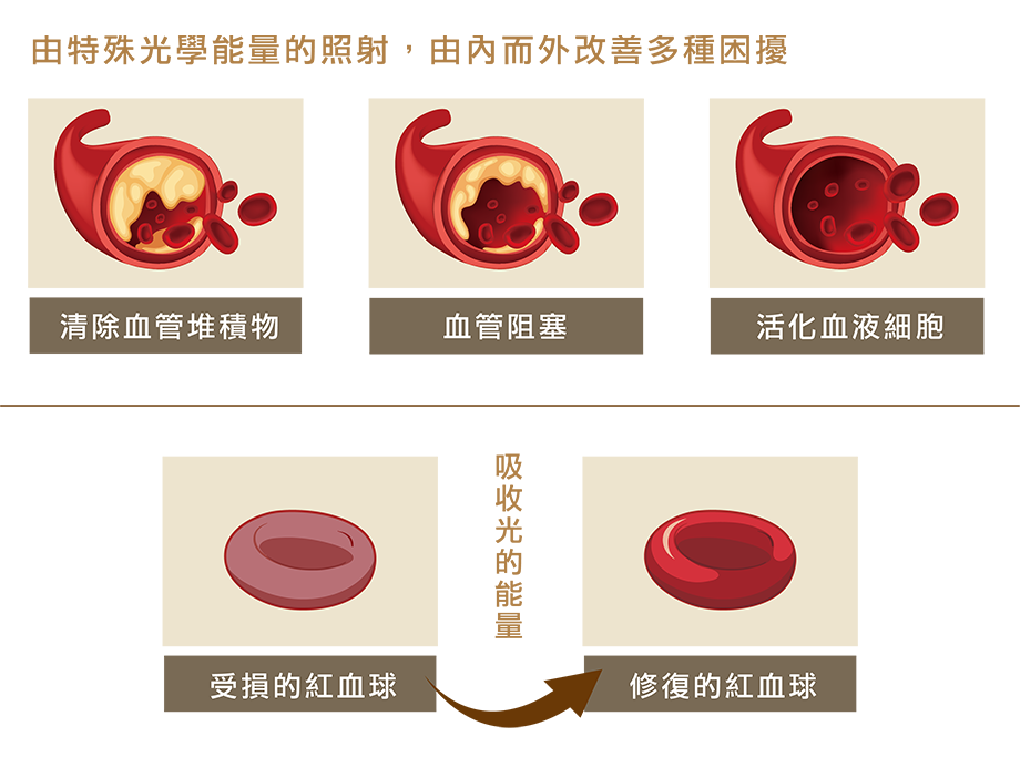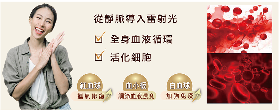 靜脈雷射(ILIB)為波長632-6600nm的雷射光波,是一種低能量的雷射治療,利用光纖導將雷射光從手臂靜脈處導入,當血液流過此處時就像在照射日光浴般,可增加體內的核甘酸(ATP)分子提供代謝能量、刺激粒腺體的活性,使紅血球的攜氣能力增加(給氣),白血球及其他免疫相關的機能也會改善(排毒),具有清除體內自由基、減少身體發炎、活化血液、降低血脂、修復神經病變等臨床研究之效果。